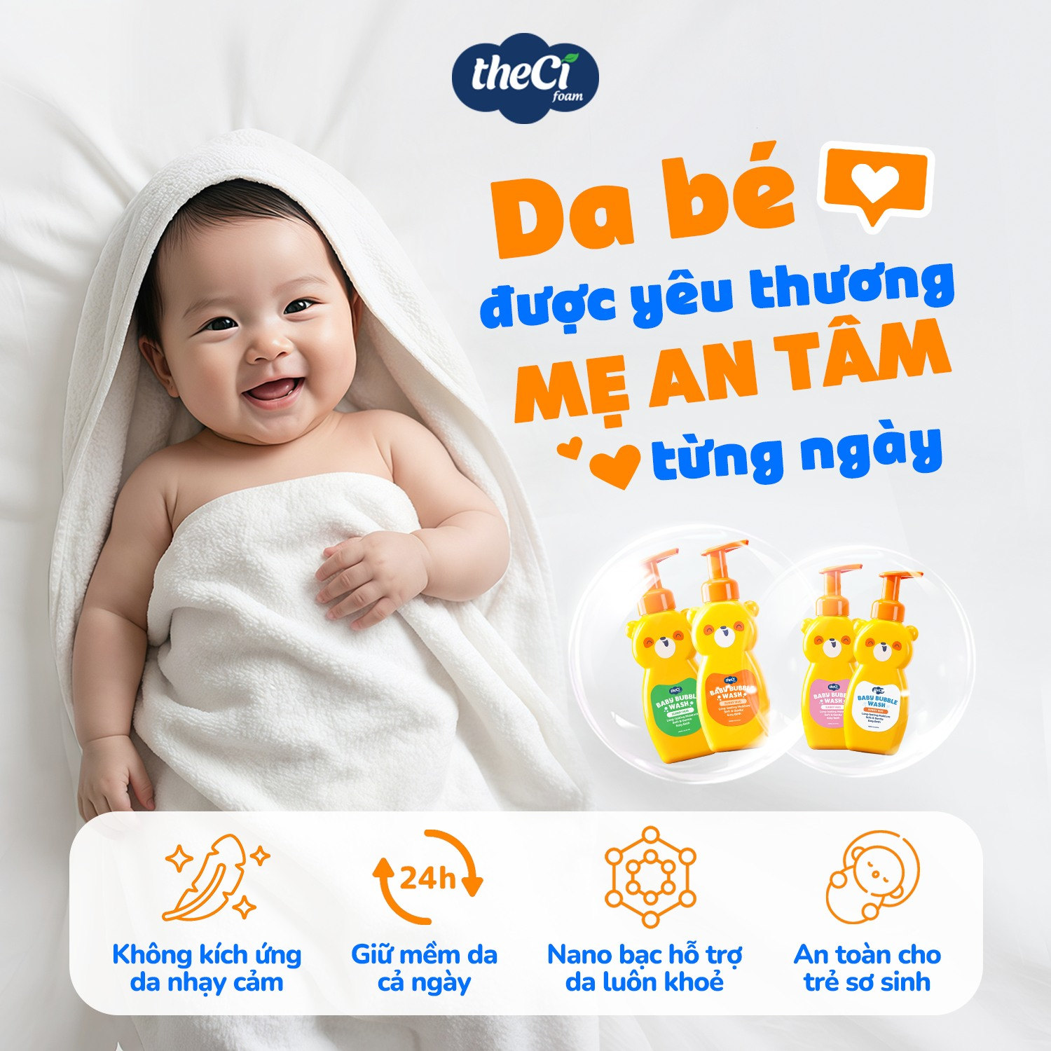 Bọt tắm gội trẻ em với công thức dịu nhẹ, an toàn tuyệt đối cho làn da nhạy cảm của bé. Sản phẩm chứa các thành phần thiên nhiên như Hydroxyethyl Urea giúp dưỡng ẩm sâu, dầu jojoba nuôi dưỡng làn da mềm mịn, kết hợp với chiết xuất lô hội, trà xanh và trà ngàn hoa làm dịu da, kháng viêm, bảo vệ da bé khỏi vi khuẩn gây hại. Sản phẩm tạo bọt mịn, dễ xả sạch, mang lại cảm giác thư giãn, sạch sẽ và mềm mại sau mỗi lần tắm gội. Dung tích: 350ml