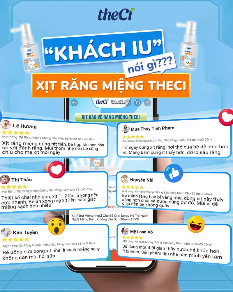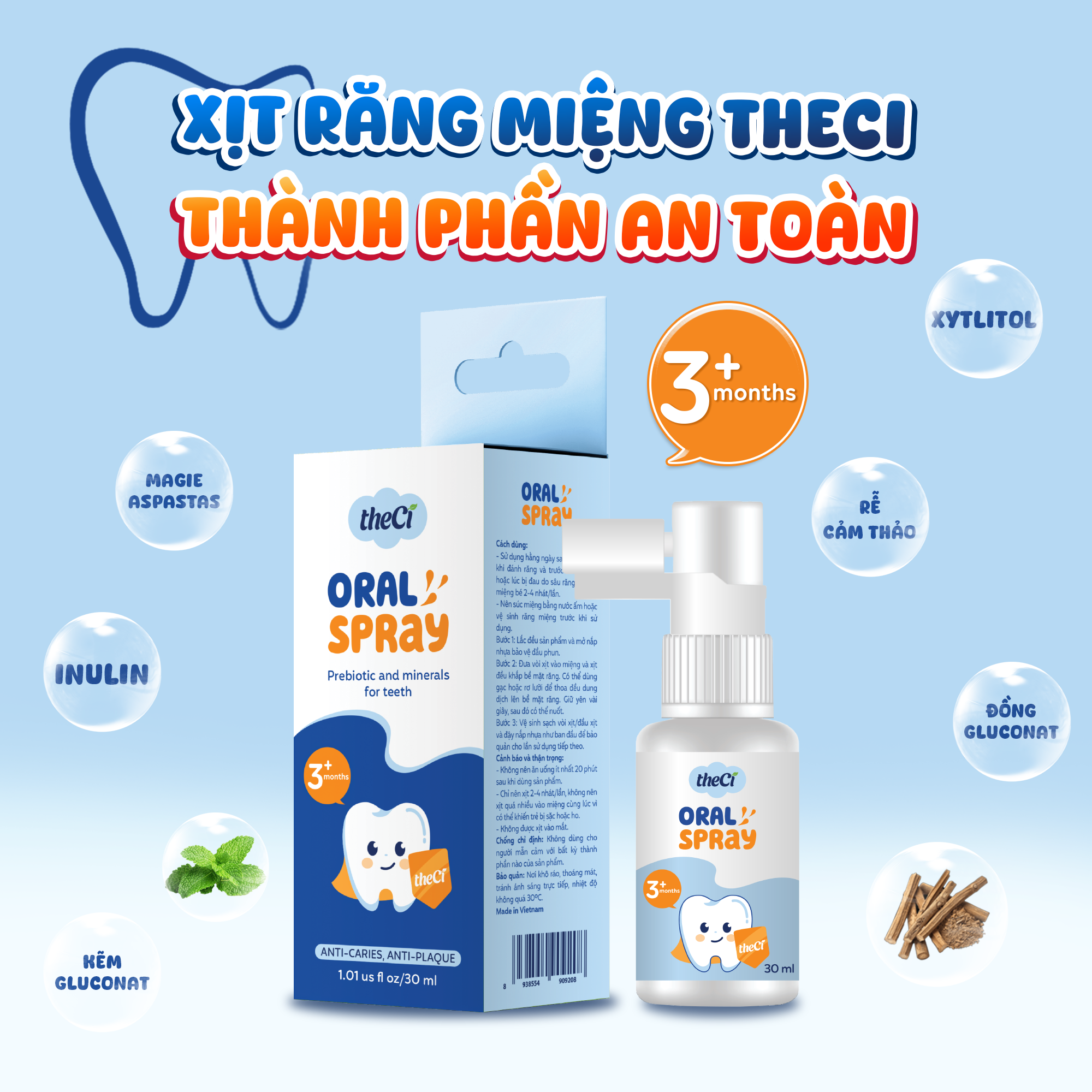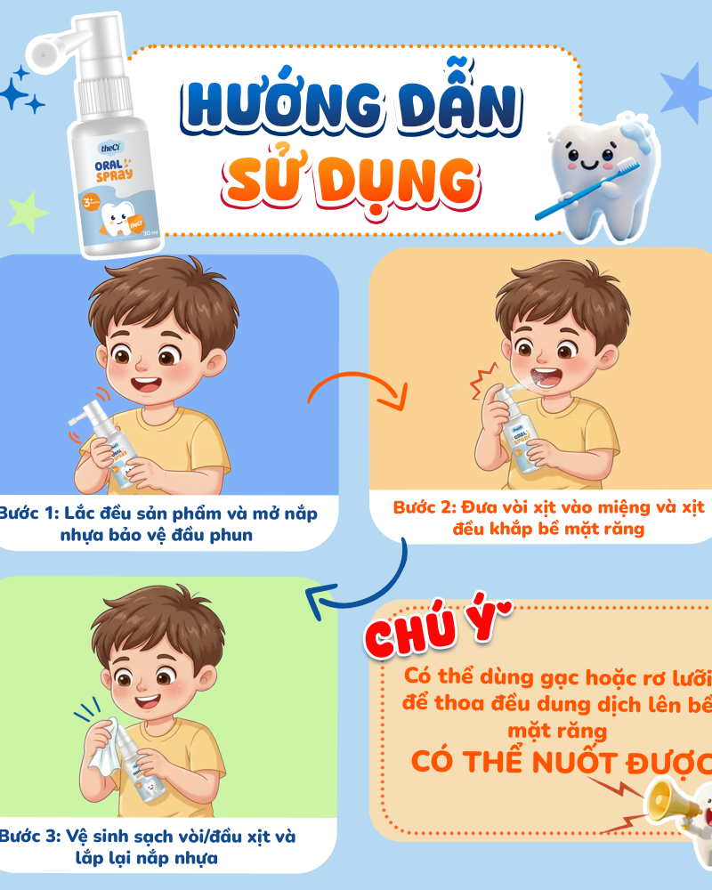 Xịt Răng Miệng Chống Sâu Răng Dành Cho Bé theCi Oral Spray 30ml chiết xuất thiên nhiên kết hợp cùng hoạt chất Xylitol và hỗn hợp khoáng chất mang lại hiệu quả cao trong việc bảo vệ răng miệng cho bé giai đoạn sớm từ 03 tháng tuổi: